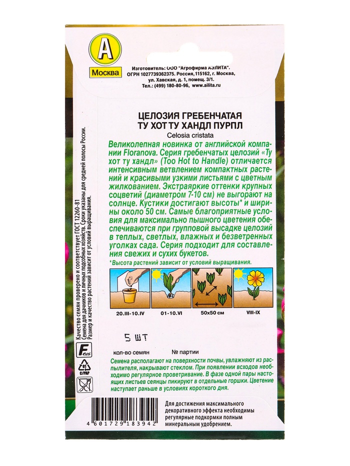 Семена цветов Целозия гребенчатая Ту хот ту хандл пурпл С. Floranova Золотая серия, Ц/П,5 шт. 10945