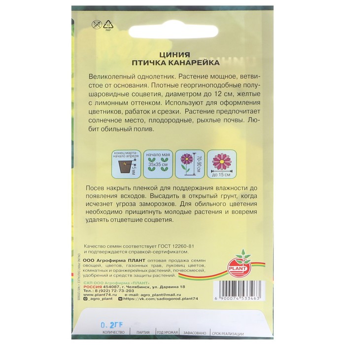 Семена цветов Циния "Птичка канарейка", 0,2 г
