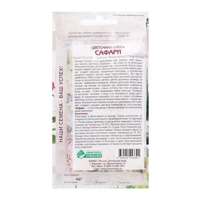 «Сафари» - впечатляющий дуэт обильно цветущих петуний для всех видов озеленения. Посев ведут в марте-апреле на рассаду. Гранулы располагают по поверхности слегка уплотненной и увлажненной почвы, не заделывая их. Посевы хорошо увлажняют из распылителя, накрывают стеклом и содержат при температуре 18-22 градусов С. Оболочка гранул должна раствориться. Всходы появляются через 10-15 дней.
