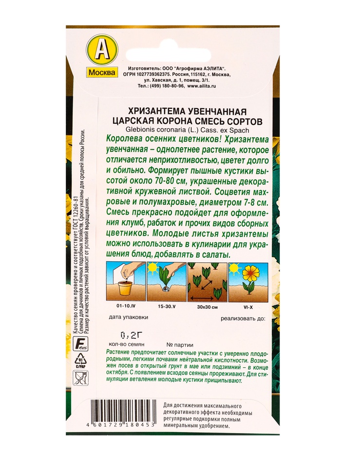 Семена цветов Хризантема махровая Царская корона, смесь сортов Золотая серия, Ц/П,0,2 г