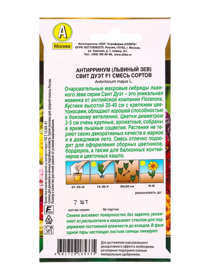 Семена цветов Львиный зев Свит дуэт F1, смесь сортов С. Floranova Золотая серия, Ц/П,7 шт.