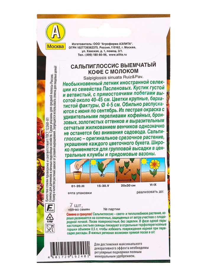 Семена цветов Сальпиглоссис Кофе с молоком (драже в пробирке) Золотая серия, Ц/П,7 шт.