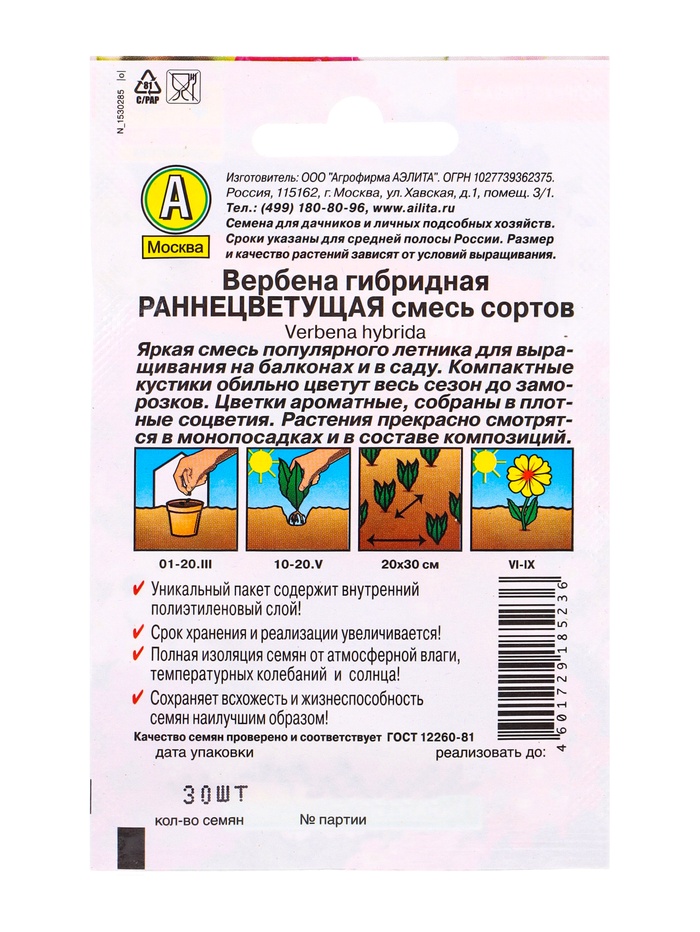 Семена цветов Вербена Раннецветущая, смесь сортов , Лидер,30 шт.