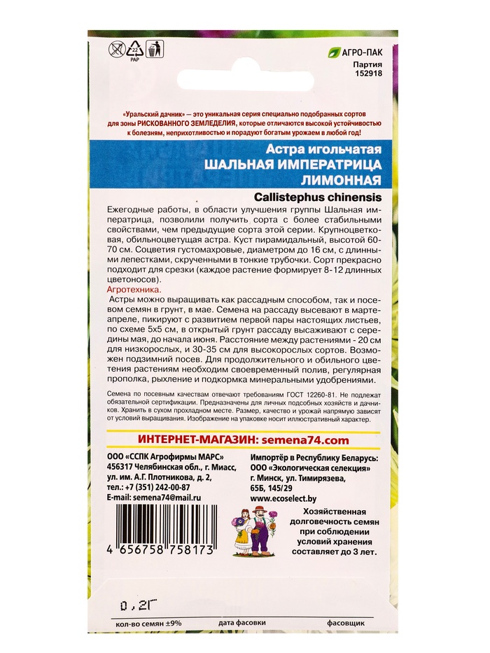 Семена Цветы Астра игольчатая Шальная императрица лимонная (УД) Е/П , Е/П, 0,2 г. (комплект 2 шт)