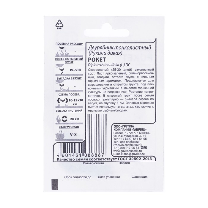 Семена Двурядник тонколистный (Рукола дикая) "Рокет", б/п, 0,5 г