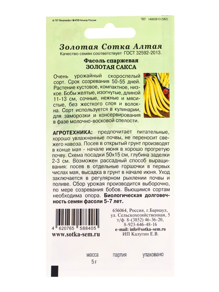 Семена Фасоль «Золотая Сакса», 5 г, «Золотая Сотка Алтая» (комплект 2 шт)