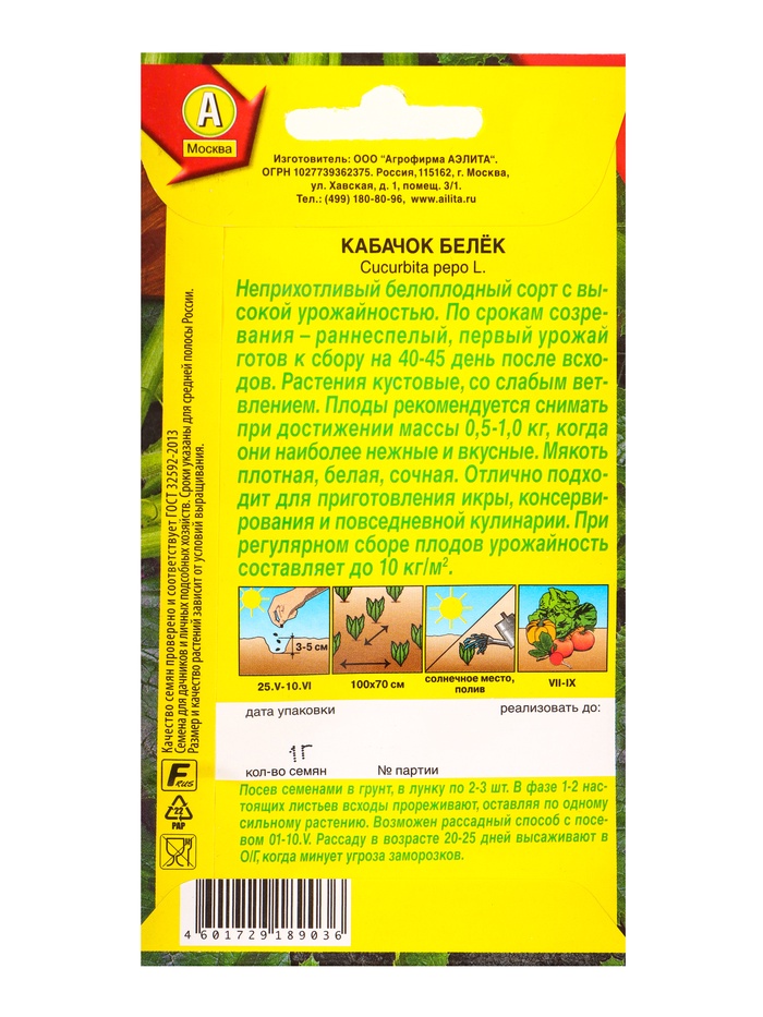 Семена Кабачок белоплодный «Белёк», 1 г, «Агрофирма АЭЛИТА» (комплект 2 шт)