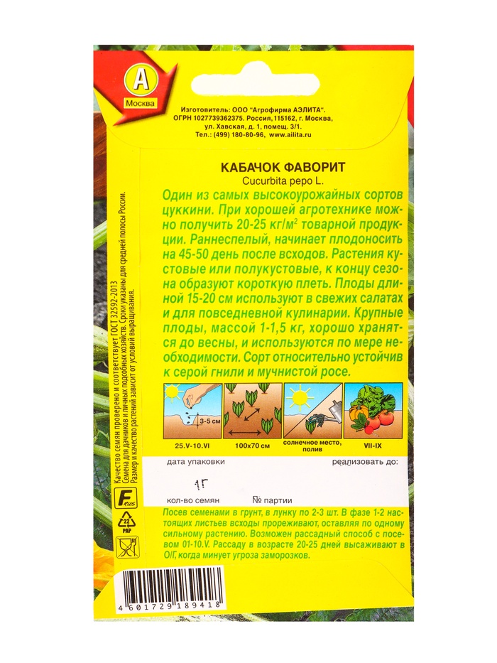 Семена Кабачок цуккини «Фаворит», 1 г, «Агрофирма АЭЛИТА» (комплект 2 шт)