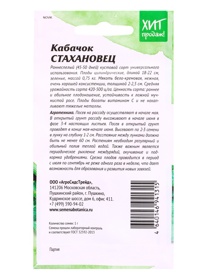 Семена Кабачок «Стахановец», 1 г, ранний, «АгроСидсТрейд» (комплект 2 шт)
