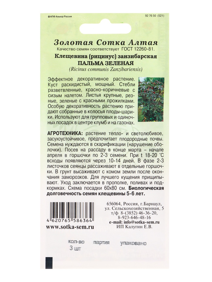 Семена Клещевина занзибарская «Пальма зеленая», 3 шт., «Золотая Сотка Алтая» (комплект 3 шт)