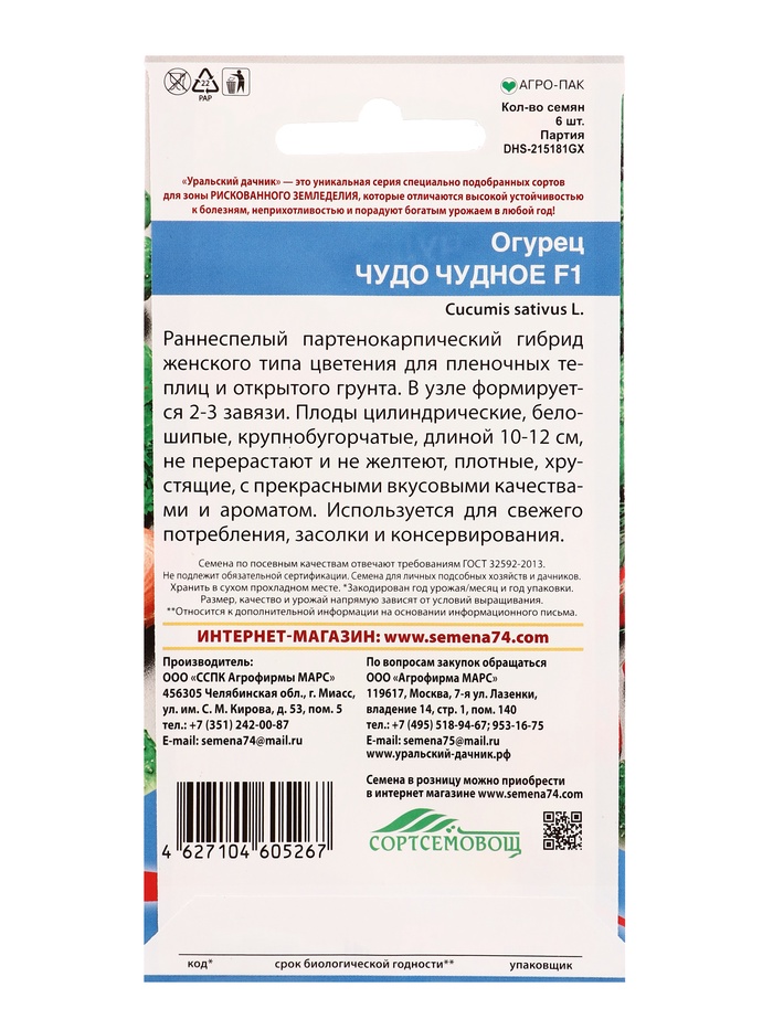 Семена Огурец Чудо чудное F1 (УД) Е/П , Е/П, 6 шт. (комплект 2 шт)