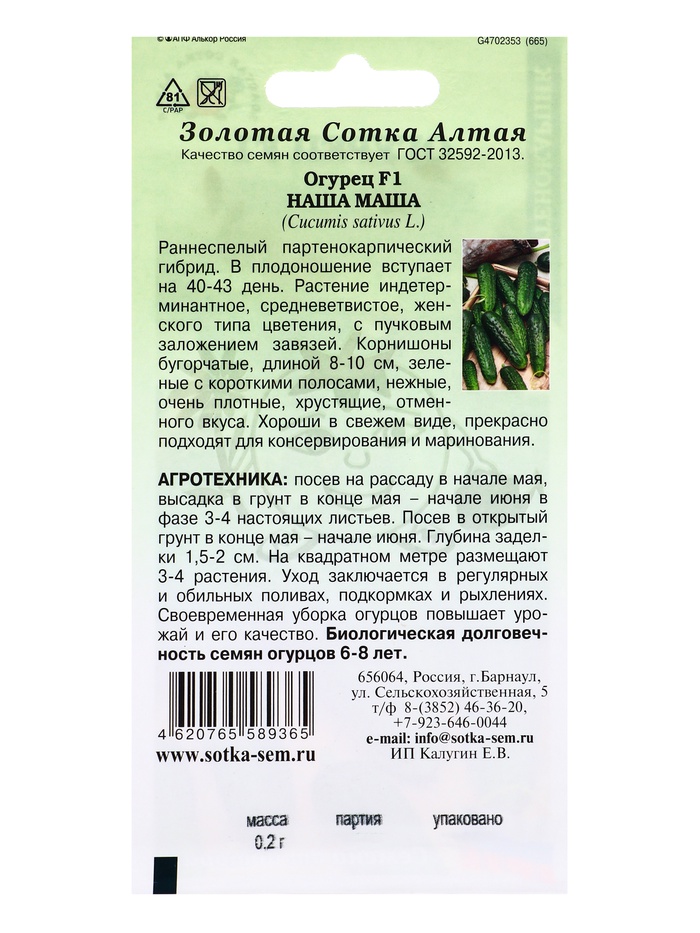 Семена Огурец «Наша Маша», F1, 0.2 г, партенокарпический, раннеспелый, «Золотая Сотка Алтая» (комплект 2 шт)