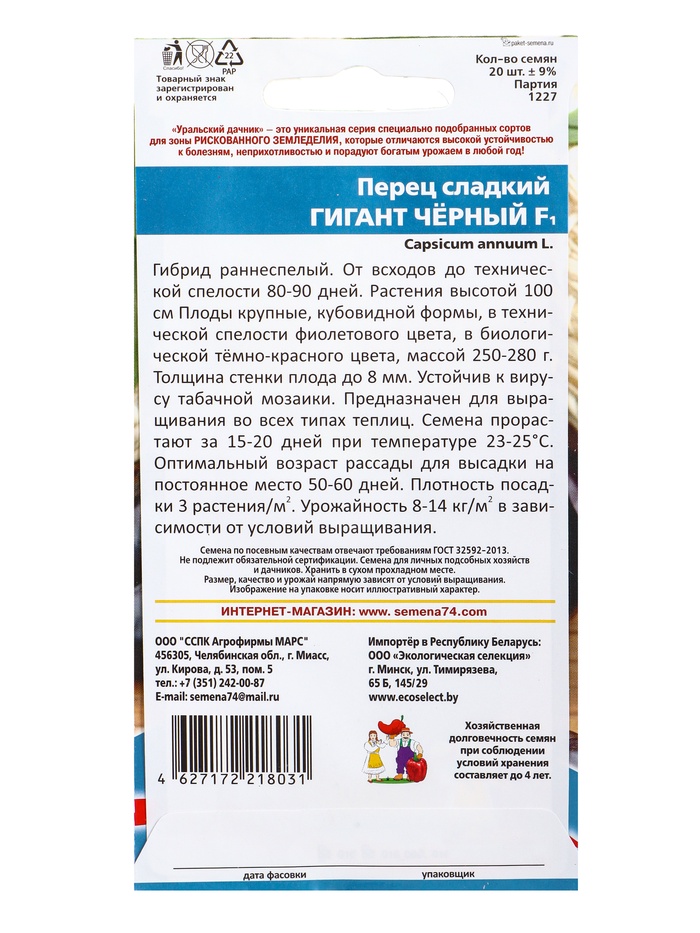 Семена Перец сладкий Гигант чёрный F1 (УД) Е/П , Е/П, 20 шт. (комплект 2 шт)