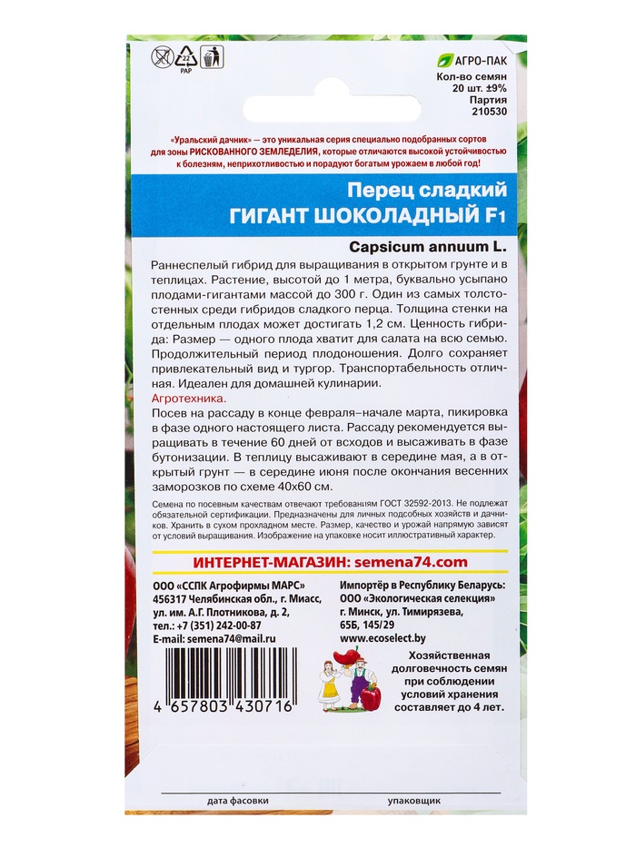 Семена Перец сладкий Гигант шоколадный F1 (УД) Е/П , Е/П, 20 шт. (комплект 2 шт)