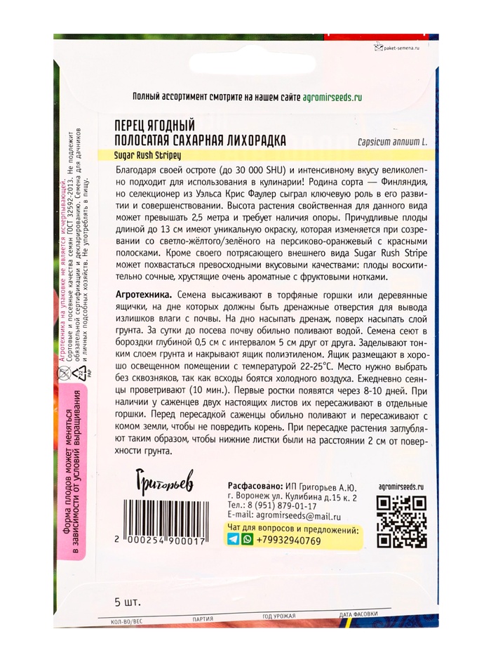Семена Перец ягодный Полосатая Сахарная Лихорадка (Sugar Rush Stripey) 5 шт. / НОВИНКА 12.29 г. 109