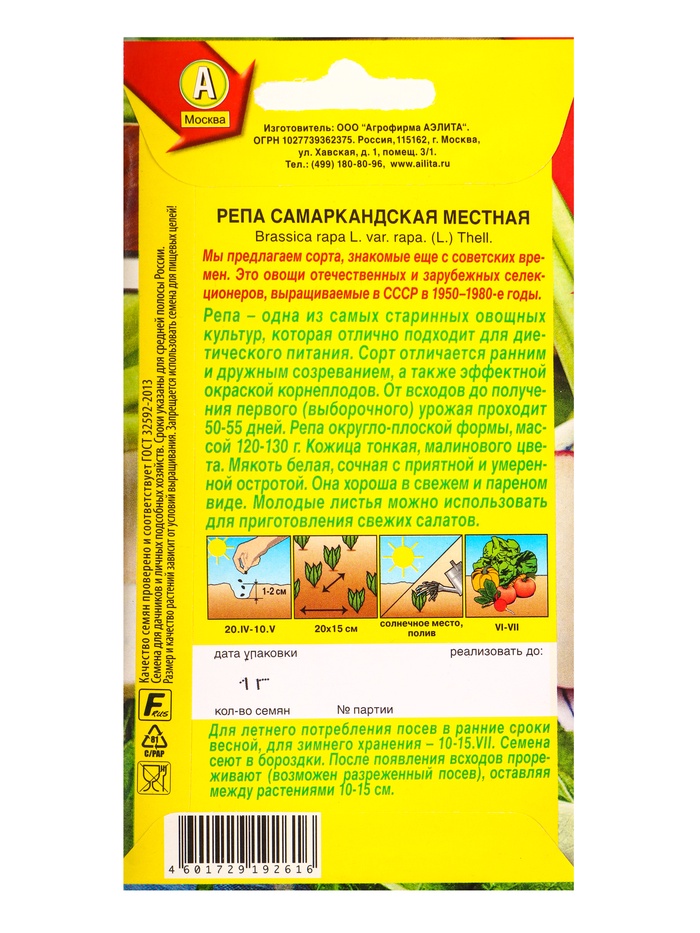 Семена Репа «Самаркандская местная», «Сделано в СССР - Агрофирма АЭЛИТА», 1 г (комплект 2 шт)