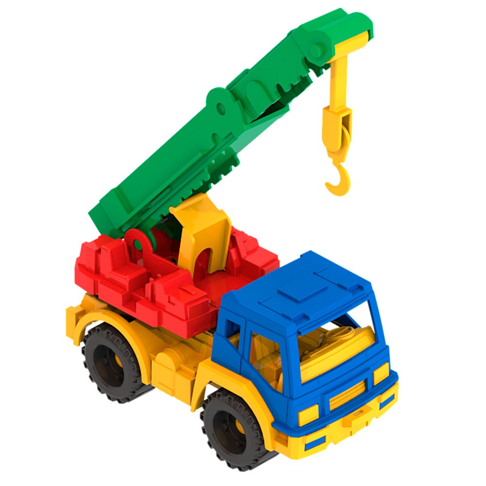 Машинка оснащена подвижным краном с крюком и кольцом на переднем бампере, куда можно продеть верёвочку, чтобы катать машинку за собой.