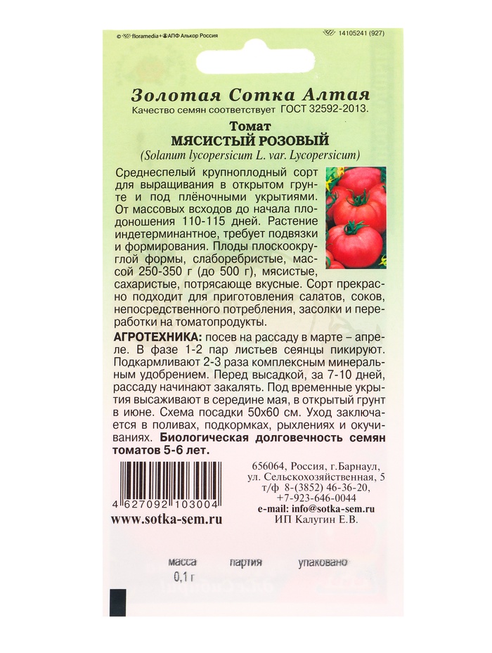 Семена Томат Мясистый розовый /Сотка/ 0,1г/среднесп. индет. 250-350г/*1500 (комплект 3 шт)