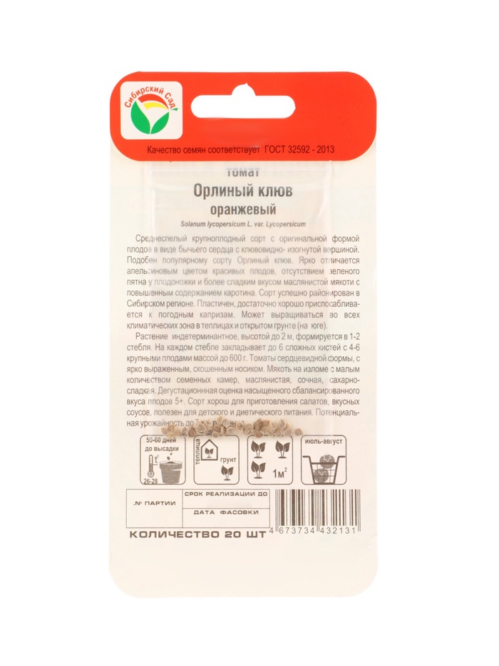 Семена Томат «Орлиный клюв», оранжевый, 20 шт., «Сибирский сад»