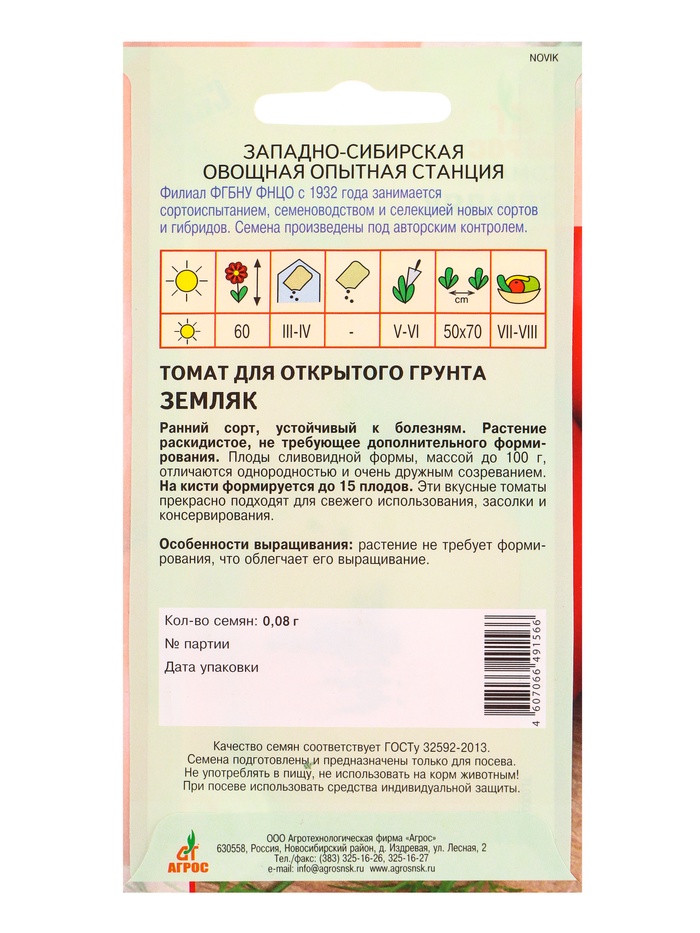 Семена Томат «Земляк», 0.08 г, «Агросс» (комплект 4 шт)
