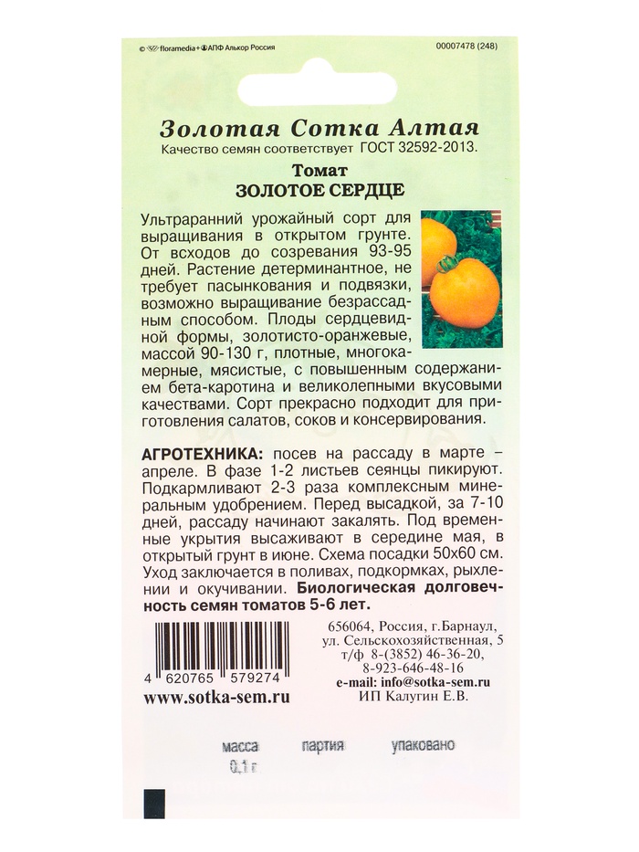 Семена Томат «Золотое сердце», 0.1 г, ультраранний, детерминантный, «Золотая Сотка Алтая» (комплект 3 шт)