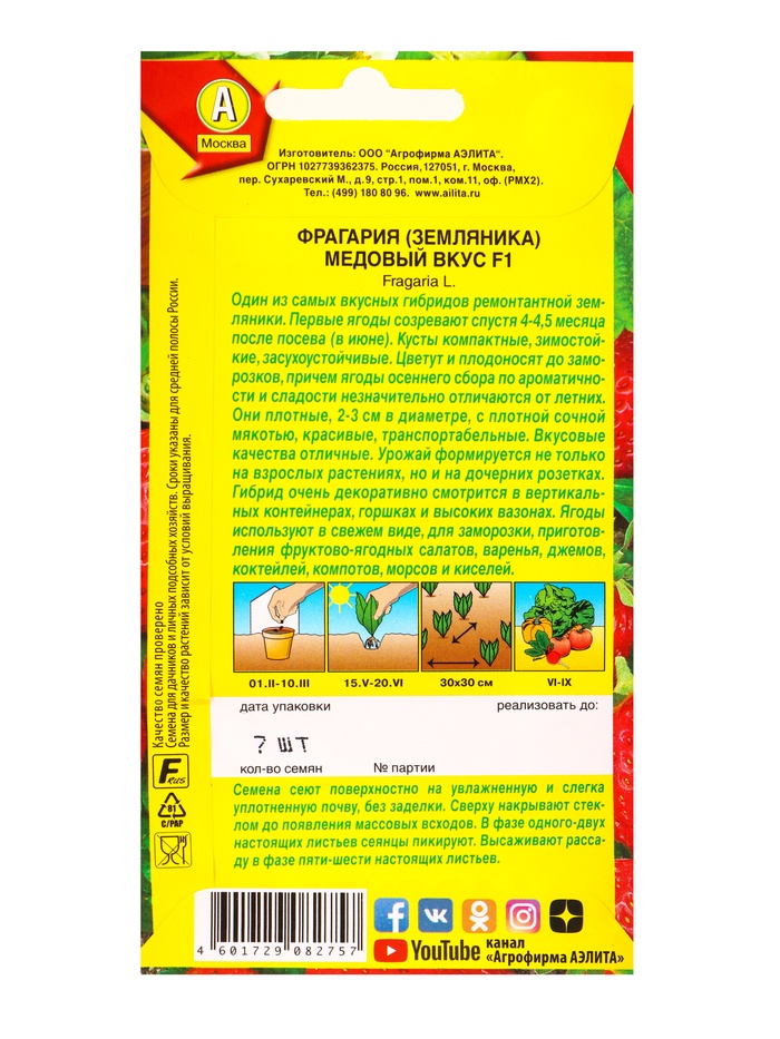 Семена Земляника ремонтантная крупноплая Медовый вкус F1, Ц/П,7 шт.