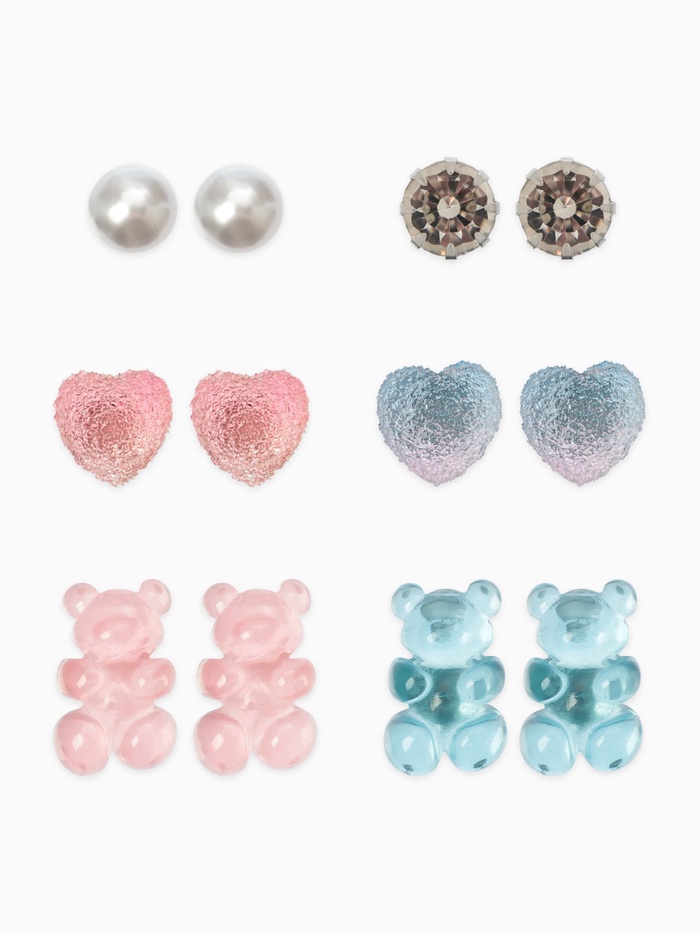 - Разнообразие в одном наборе: шесть пар серёжек с яркими и милыми мотивами мишек и сердечек в розово-голубой палитре.