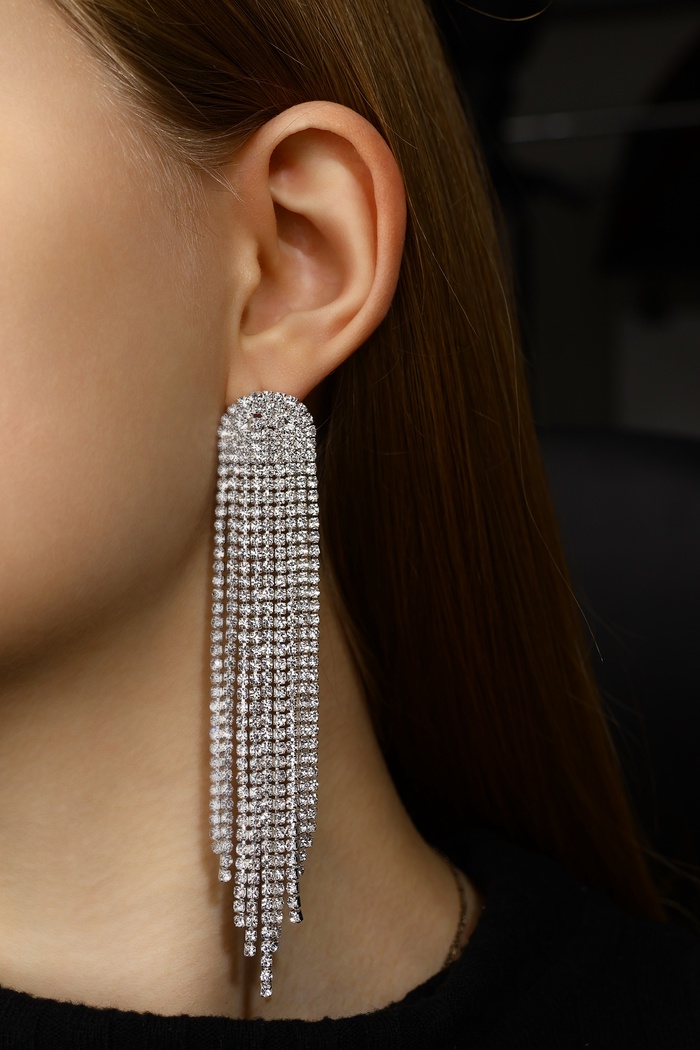 Лёгкие и изящные серьги с полукруглой формой, украшенные белыми стразами на серебристой металлической основе, создают эффект кристальной свежести и прозрачности. Их длина в 11 см подчёркивает грациозность линий и придаёт образу утончённую динамичность, идеально подходящую для праздничных и повседневных нарядов.