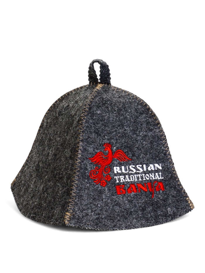 Банная шапка «Русские традиции» серая с вышивкой — классический аксессуар для парной. Универсальная форма подходит всем, а смешанный состав сохраняет функциональность настоящей валяной шапки с современной практичностью.