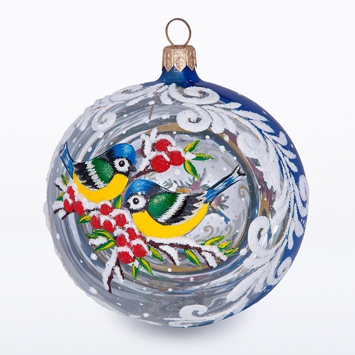 Изящный елочный шар «Дуэт» с симпатичным изображением птичек синичек подарком как взрослому, так и ребенку. Данная игрушка дополнит и украсить новогоднюю елочку, а также интерьер комнаты. Нарядная елочка подарят каждому члену семьи праздничное и, как в детстве, волшебное настроение