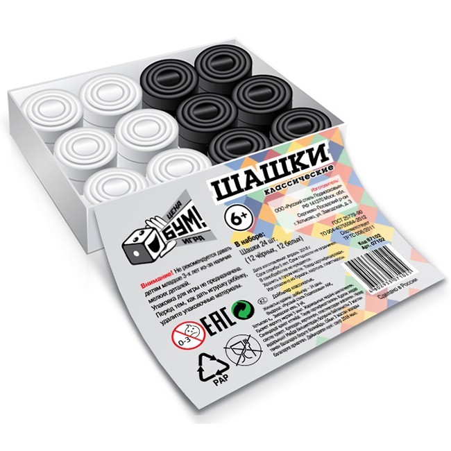 Комплектация: 24 шашки (12 черных и 12 белых)