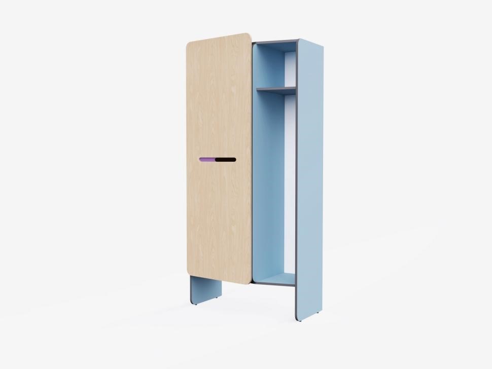 Дизайн шкафа позволяет выбирать сторону открывания дверей, а сохранность личных вещей обеспечивает наличие замка с ключами. Шкаф снабжен надёжными крючками и полками для одежды.