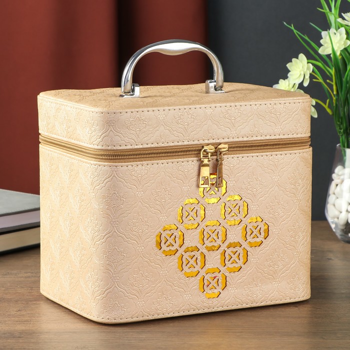 Шкатулка кожзам с зеркалом "Золотые символы" молочная 19,5х16,5х23 см