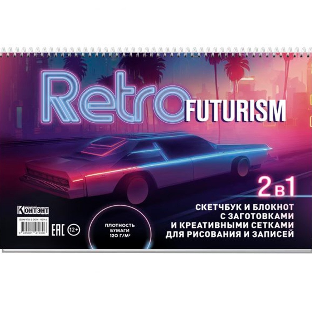 Скетчбук НЕОН 35 л с заготовками и креативными сетками д/рис и записей 2в1 Retrofuturism, с машиной