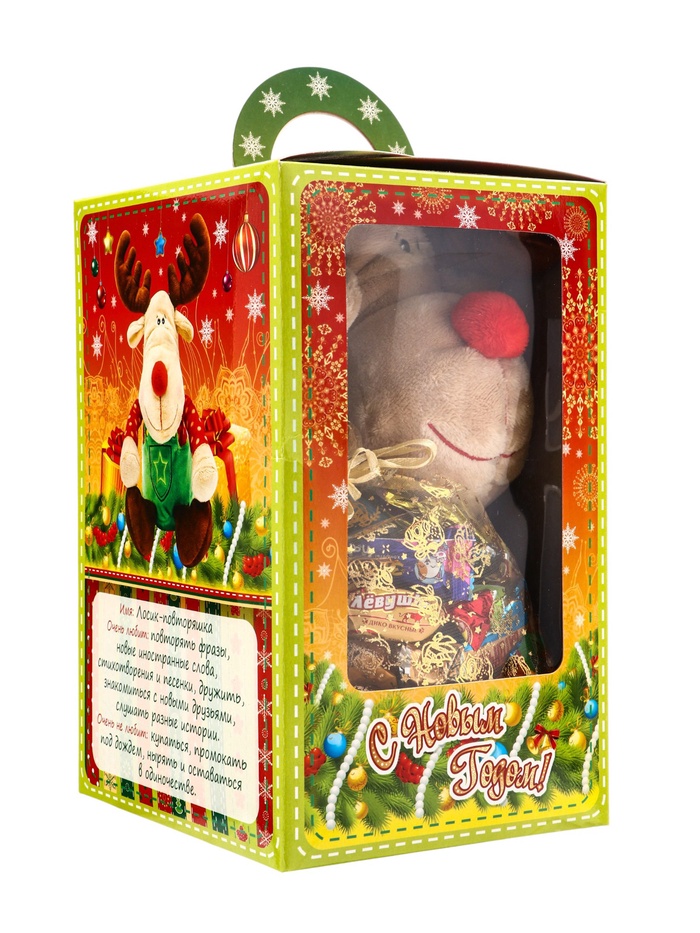 - Картонная коробка с новогодним дизайном: Упаковка с ярким оформлением создает праздничное настроение. После использования коробку можно применять для хранения мелких игрушек или детских сокровищ.