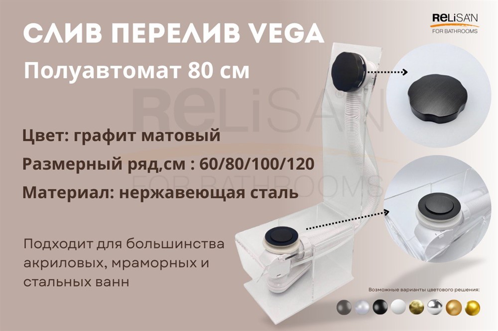 Слив- перелив полуавтомат VEGA- для акриловых, мраморных и чугунных ванн.