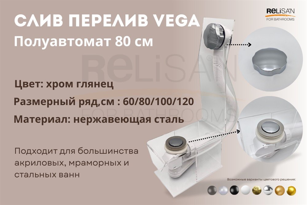 Слив- перелив полуавтомат VEGA- для акриловых, мраморных и чугунных ванн.