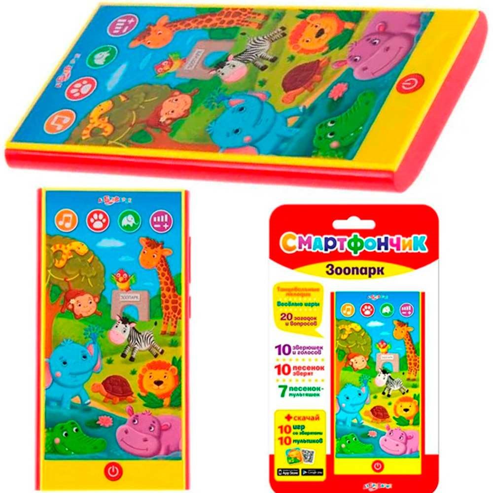 Ваш малыш любит животных? Интерактивный смартфончик «Зоопарк» познакомит его с обитателями жарких стран: львом, слоном, бегемотом, крокодилом и другими. Нажимай на картинки – и зверюшки споют о себе веселые песенки! Переключай режимы – отгадывай загадки, угадывай голоса животных, слушай хиты из мультиков: «Чунга-чанга», «Песня Львёнка и Черепахи», «Песенка о жирафе», «Песенка о лете», «Песенка друзей», «Песенка мамонтёнка», «Настоящий друг».
