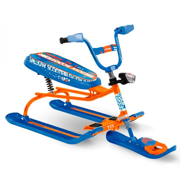 Снегокат имеет сварную конструкцию из стальных труб, пластмассовые лыжи, велоруль, удлиненное мягкое сиденье, буксировочный трос с автоматической намоткой.