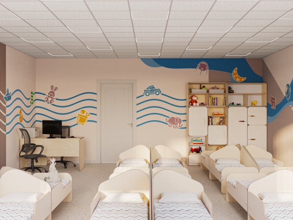 Пространство организовано с учетом потребностей как воспитанников, так и воспитателей. Удобная мебель, функциональные системы хранения и тематическое оформление помещения формируют спокойную обстановку, которая располагает к расслаблению и быстрому засыпанию.