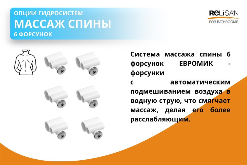 Система массажа спины 6 форсунок ЕВРОМИК - форсунки с автоматическим подмешиванием воздуха в водную струю, что смягчает массаж, делая его более расслабляющим.