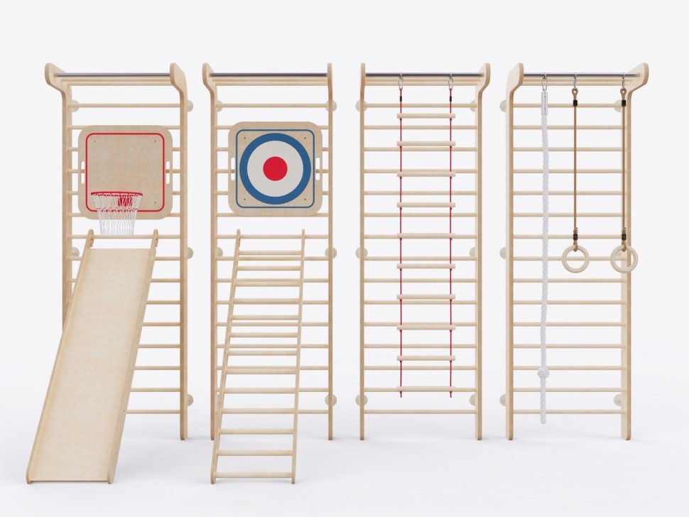 Комплекс состоит из четырех шведских стенок с турником с семью дополнительными спортивными снарядами, которые крепятся на стенку для проведения разных занятий, соревнований и игр.