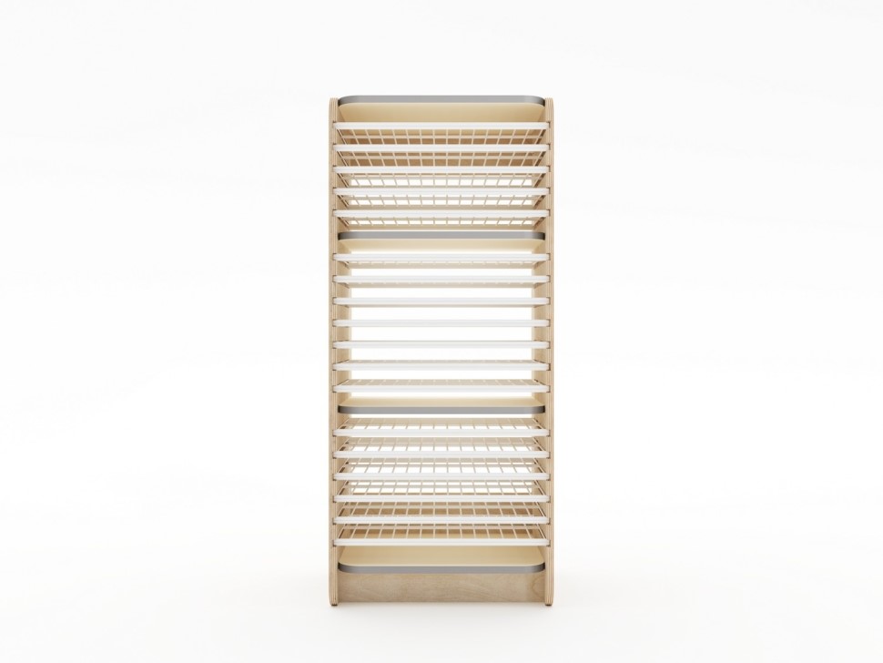 Стеллаж оснащён 21 выдвижной полкой, каждая из которых рассчитана на лист формата А3. Это позволяет одновременно сушить до 21 работ, экономя место и поддерживая порядок в классе.