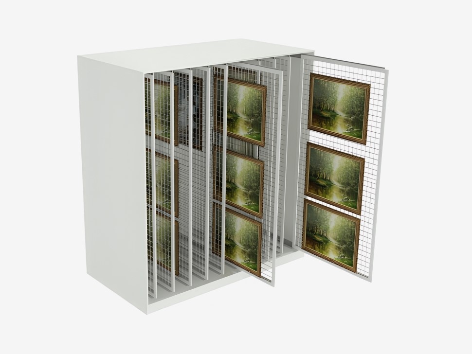 Функциональный и надежный стеллаж с выдвижными сетками — оптимальное решение для профессионального хранения музейных и выставочных образцов. Он предназначен для удобного, компактного и бережного хранения картин, рисунков и других плоских экспонатов в музеях, архивах и фондохранилищах. Позволяет организовать доступ к каждому экспонату без необходимости перемещения других.