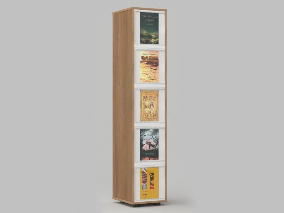 С лицевой стороны стеллажа расположены 5 прозрачных карманов, в которые удобно размещать журналы, афиши, объявления, постеры. Так читатели сразу видят новые номера и могут ознакомиться с содержанием. Сами печатные материалы хранятся внутри ящиков.