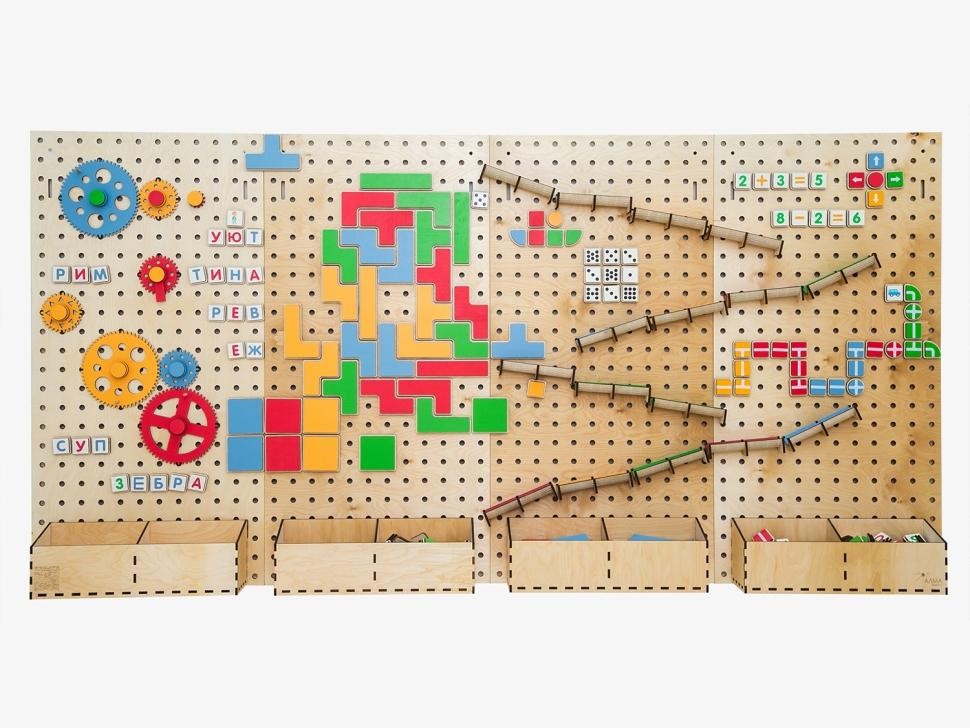 Настенный «АЛМА STEM» - это деревянный настенный конструктор с разнообразными подвижными элементами, разработанный с учетом принципов STEM образования:
