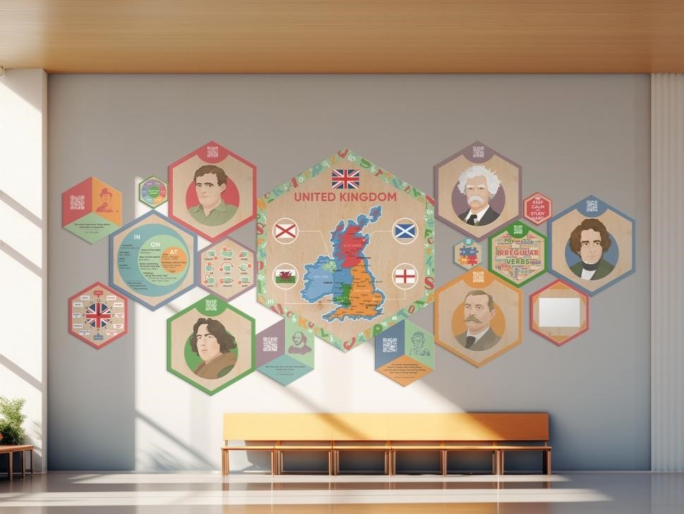 Описание и комплектация для прайсаСтендумы - это образовательные панели для оформления стен школьных учреждений. Они выполняют две функции: декорирование и обучение английскому языку. Комплект состоит из набора гексагонов различного размера, которые можно комбинировать между собой, исходя
