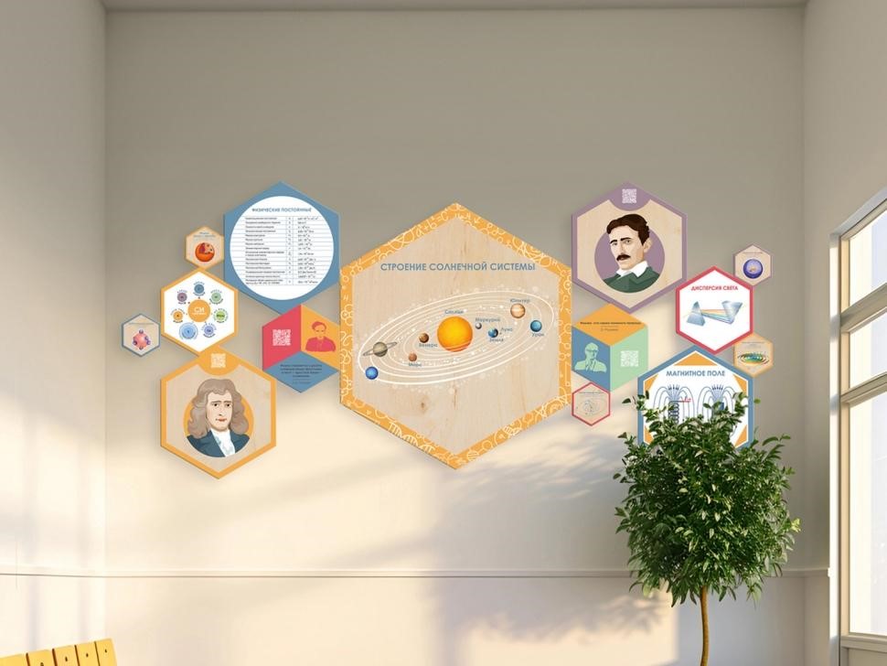 Каждый шестигранник содержит обучающую информацию: портреты выдающихся людей, их достижения и великие цитаты, основные постулаты науки, формулы, графики, теоремы. Благодаря qr-кодам дети могут подробнее узнать об учёных, изображённых на портретах, стоит только навести на них телефон.