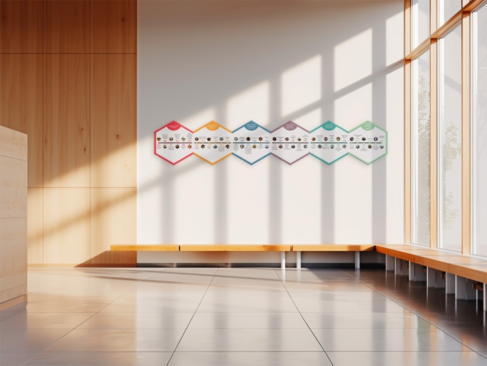 Набор «Лента времени» представляет собой комплект гексагонов одного размера, которые идут в хронологической последовательности. Панели можно размещать в классах, холлах, коридорах, зонах отдыха учебного заведения, где они будут выполнять декоративную и обучающую функции, расширять образовательную среду.