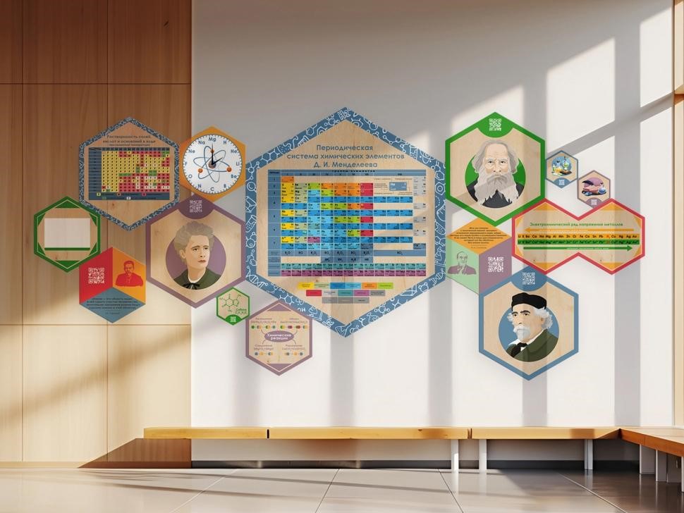 Описание и комплектация для прайсаОбразовательные панели для оформления стен школьных учреждений. Выполняют две функции: декор и наглядная опора в обучении. Состоит из набора гексагонов различного размера, которые можно комбинировать по желанию. Соответствует школьной программ